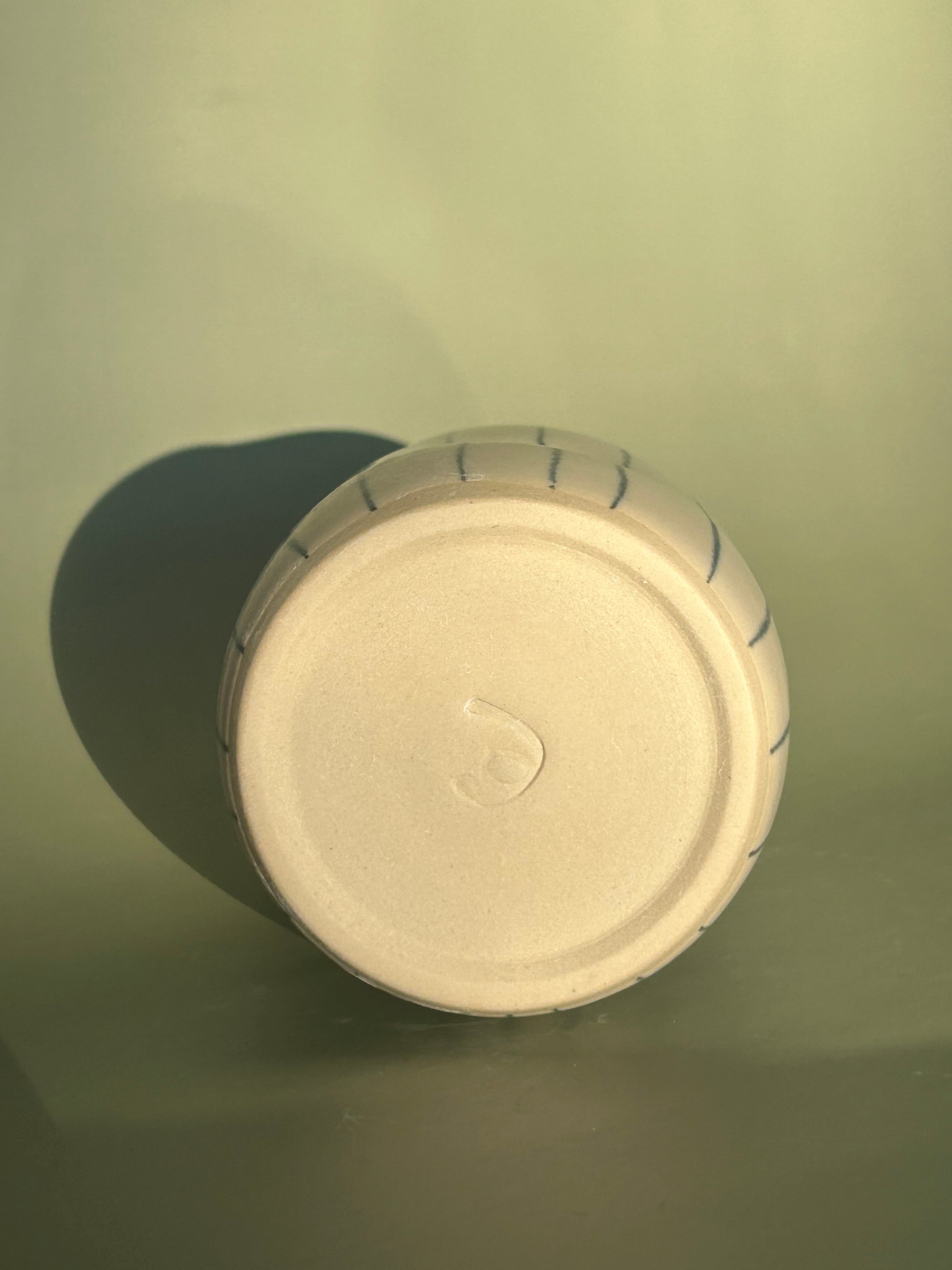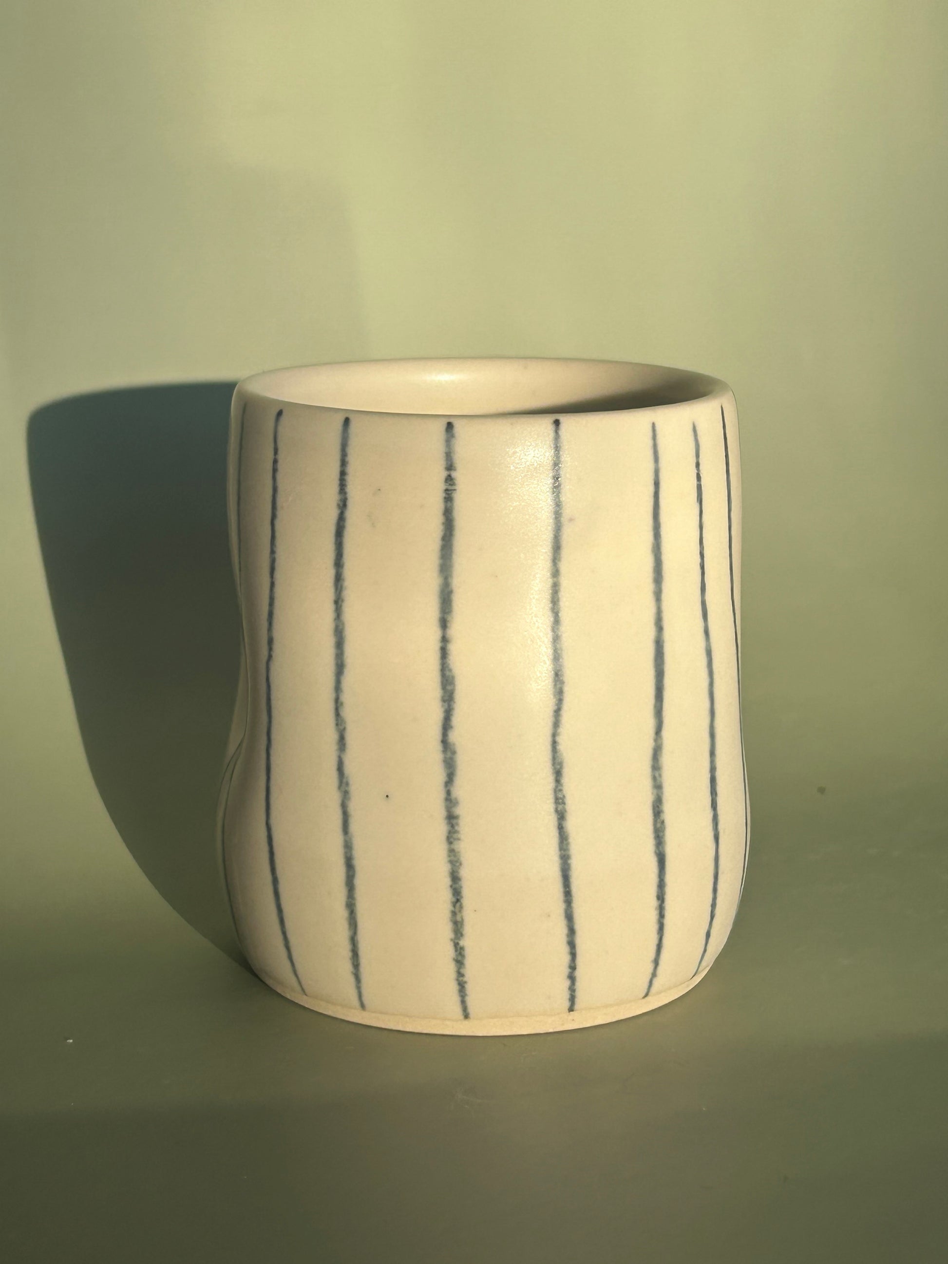 Cup with dimples for a cozy hand hold. Holds about 8oz of liquid